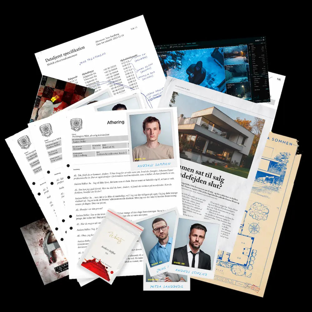 Vælg en af vores spændende mordgåder. Sagen leveres flot indpakket hjem til dig – med alt, hvad du behøver for at påbegynde efterforskningen.